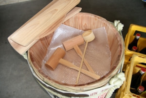 新品の樽を使用し、開けやすいようにすでに、開いた樽を用意します。あとは、鏡割りする前に、お酒を入れるだけで簡単です。